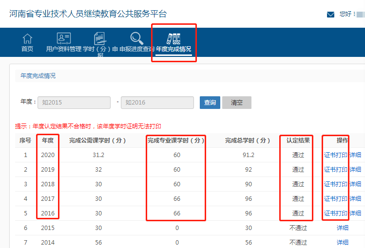 请全校专业技术人员自行登录河南省专业技术人员继续教育信息服务平台https://manage.hnzjgl.gov.cn/?role_system=8,点击“年度完成情况”查看2016-2019年度继续教育认定结果,认定结果为不通过的均需补录相应年度的继续教育学时。尚未注册的请先注册。