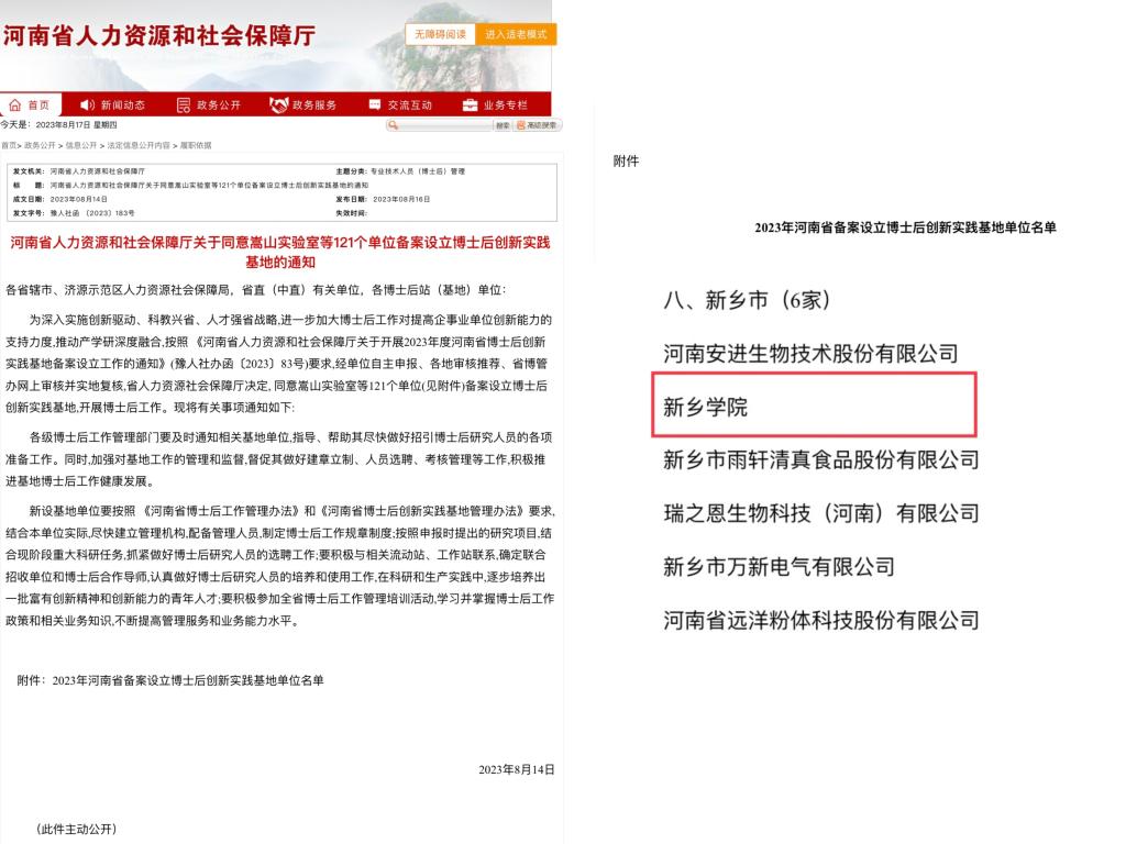 8月16日,河南省人力资源和社会保障厅下发了《河南省人力资源和社会保障厅关于同意嵩山实验室等121个单位备案设立博士后创新实践基地的通知》,yl23411永利官网获批为博士后创新实践基地,在推进高水平教学科研平台建设方面取得重大突破,为推动yl23411永利官网硕士学位授予单位立项建设、一流学科建设以及人才工作奠定了良好基础。